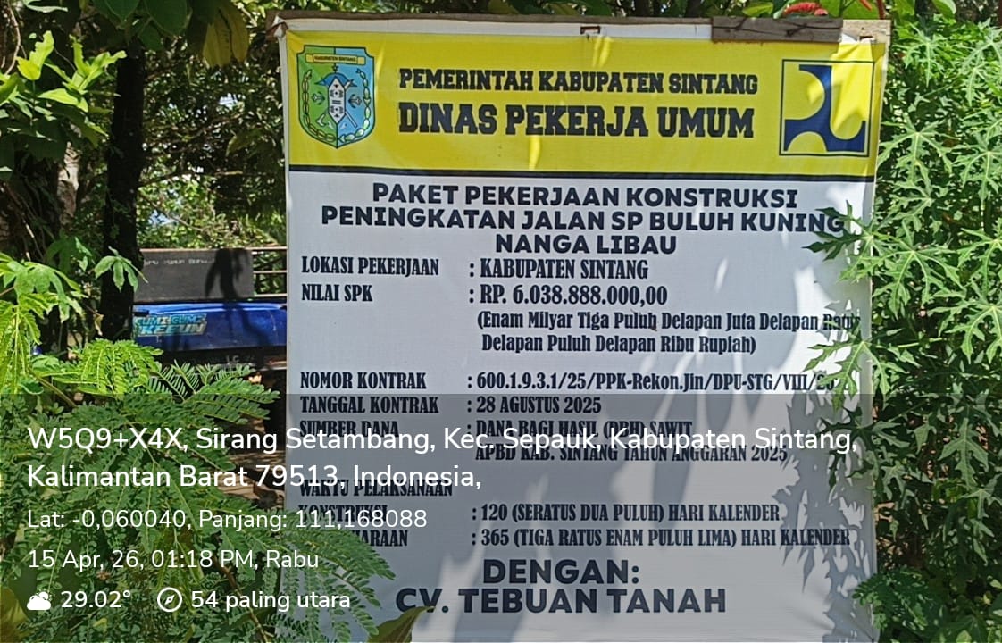 Sintang,KALBAR,PWMEDIATV.COM 24 April 2026.Proyek peningkatan jalan ruas SP Buluh Kuning–Nanga Libau di Kecamatan Sepauk, Kabupaten Sintang, Kalimantan Barat, yang dibiayai dari APBD Tahun Anggaran 2025 senilai Rp 6.038.888.000, kini menjadi…
