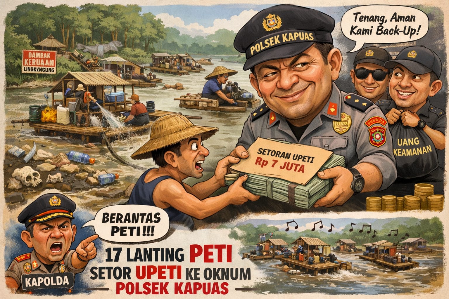 Sumber menyebutkan, terdapat setoran sekitar Rp7 juta yang diantarkan seseorang ke Polsek Kapuas pada Senin, 2 Februari 2026. Uang tersebut diduga berasal dari kumpulan para pemilik lanting PETI sebagai “uang keamanan”.